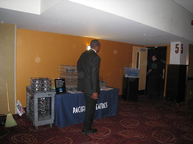会場の入口で3-Dメガネを貸与されるのだがごっつい兄ちゃんがモノモノしい顔で配っていて怖い怖い(笑)。 しかもこのメガネ、一応簡単にはレンズを拭いてくれるが子供がポップコーンを食べた手でレンズを触るせいかあまり綺麗じゃないのだ。 そゆわけで、メガネ拭きもしくはペーパーを持参すべし。 (トイレなどで一旦会場を離れるだけでも返却しなきゃならないってのも厳しい!)